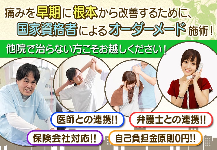 ませ接骨院は、むちうちに大変詳しい「弁護士法人心」さんの指導を受けておりますので、保険会社対応も万全です。